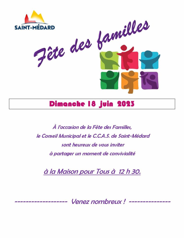 À l’occasion de la Fête des Familles, le Conseil Municipal et le C.C.A.S.de Saint-Médard sont heureux de vous inviter à partager un moment de convivialité à la Maison Pour Tous à 12h30 !