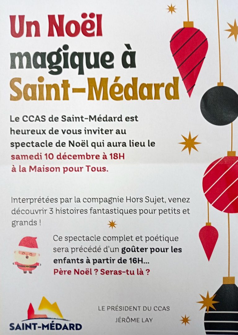 Le CCAS de Saint-Médard est heureux de vous inviter au spectacle de Noël qui aura lieu le samedi 10 décembre à 18h à la Maison pour tous. Interprétées par la compagnie Hors Sujet, venez découvrir 3 histoires fantastiques pour petits…