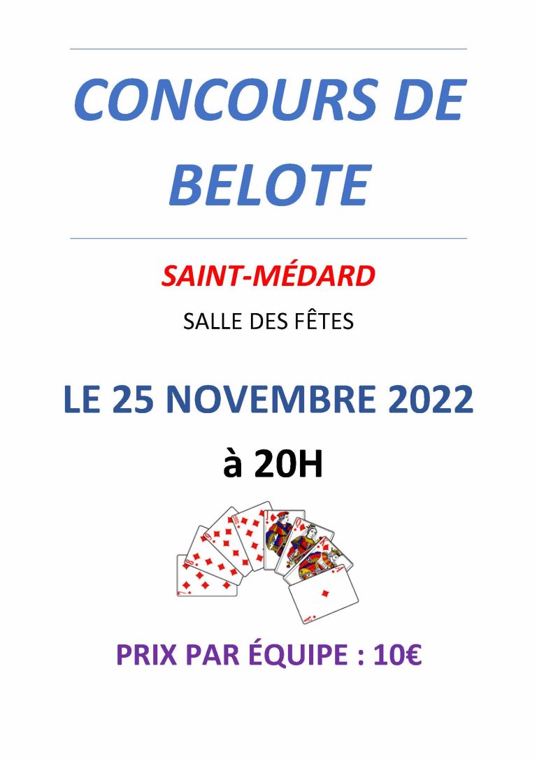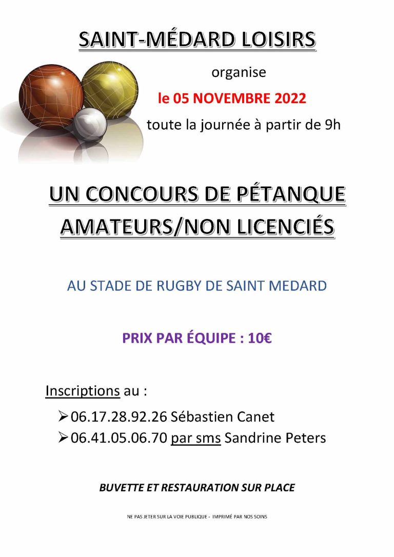 L’association Saint-Médard Loisirs organise un concours de pétanque amateurs & non-licenciés ce samedi 05 novembre 2022. Toute la journée à partir de 9h, au stade de rugby de Saint-Médard. Prix par équipe : 10 euros. Inscriptions auprès de Sébastien Canet…