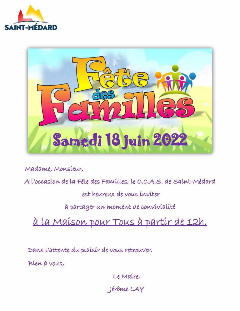 À l’occasion de la Fête des Familles, le C.C.A.C. de Saint-Médard est heureux de vous inviter à partager un moment de convivialité à la Maison pour tous à partie de 12h le samedi 18 juin 2022.